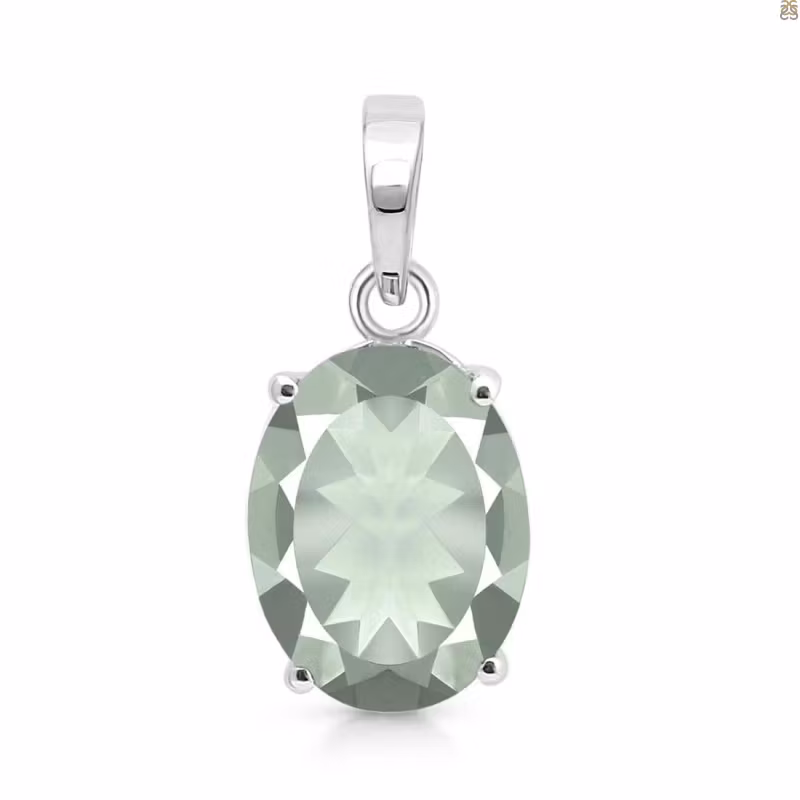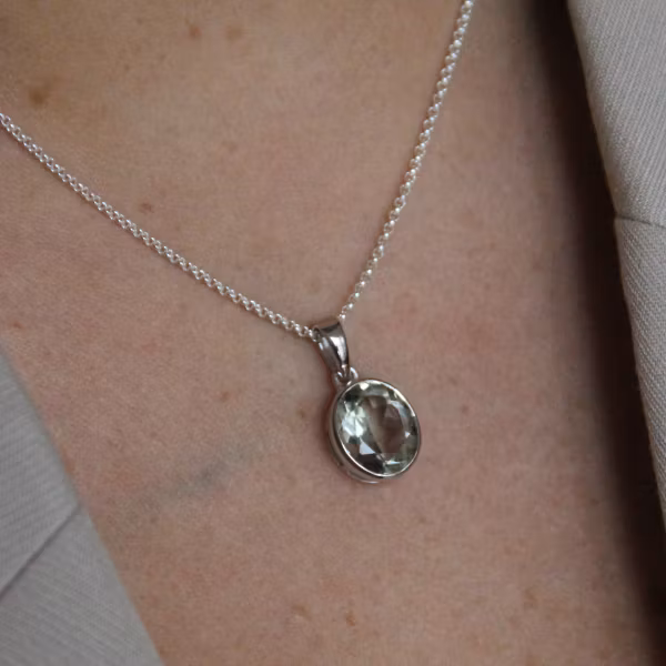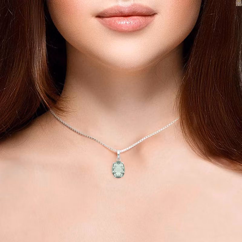 En otroligt vackerT halsband med silverinfattad grön ametist. Stenens storlek är ca 10x8mm. GRÖN AMETIST: Gröna ametisten sägs främja intuition, kreativite