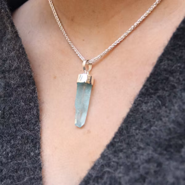 Rå akvamarin är en otroligt vacker ädelsten som påminner om en droppe vatten. Den kommer i en ljus blå nyans som är lugnande och harmoniskt. Det sägs ju också att den lugnar tankar och hjärtan.