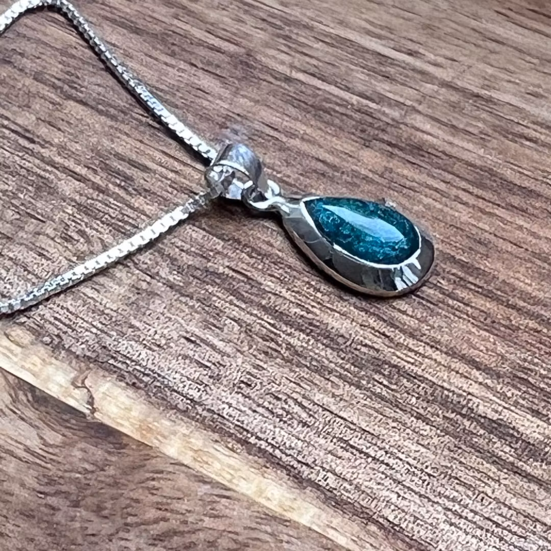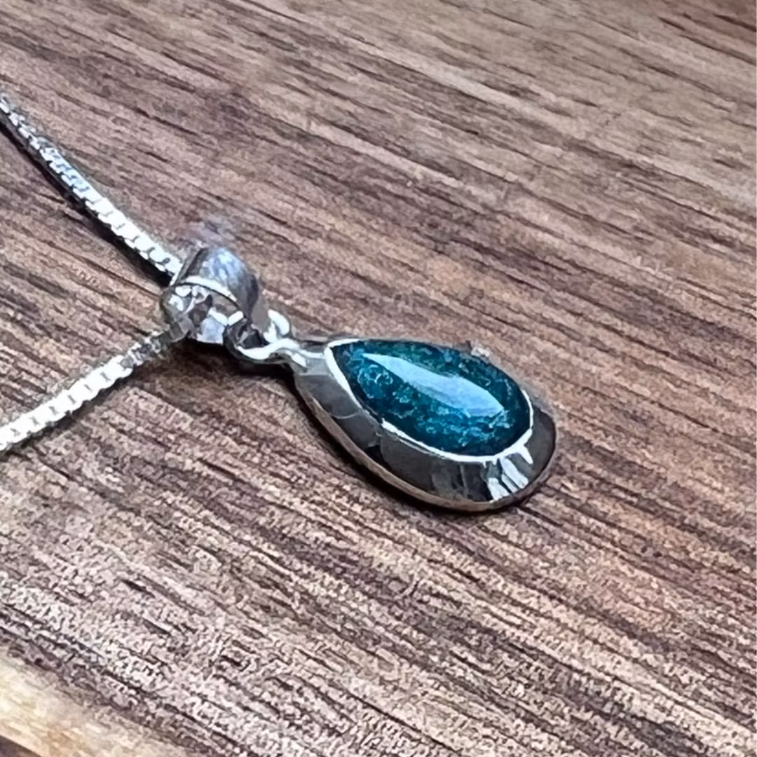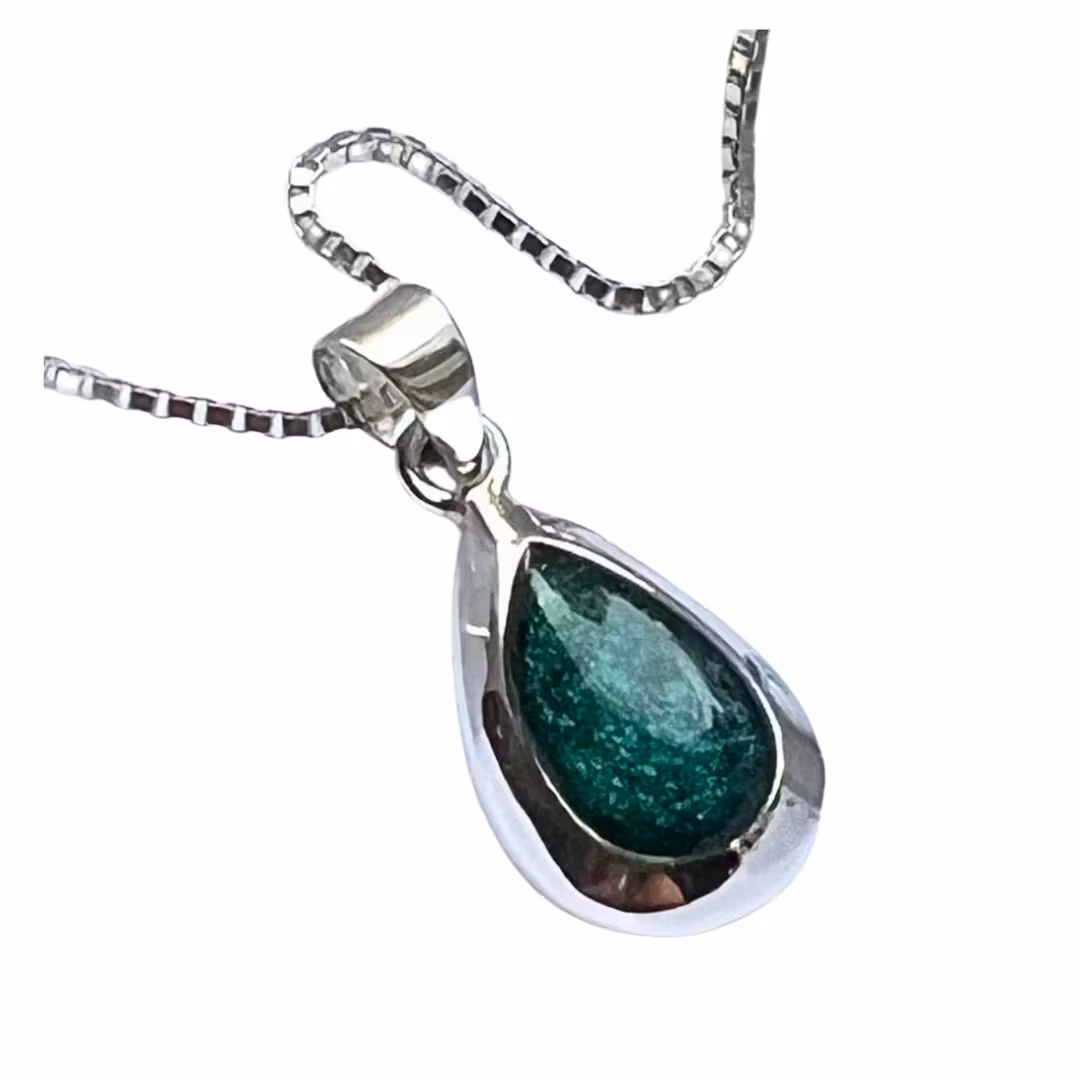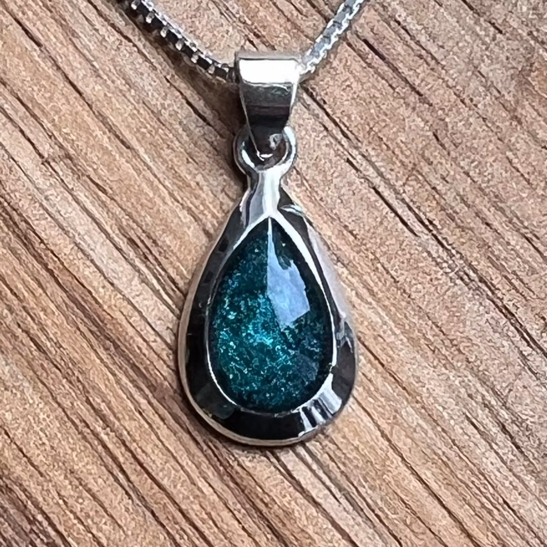 Ett vackert och klassiskt smycke i form av en droppe i äkta sterling silver. Bär minnet av en nära person, djur eller en härlig upplevelse nära dig. Minnessmycket på bilden är infuserat med aska som lagts på en botten med färgen black sea. (mörkgrön)