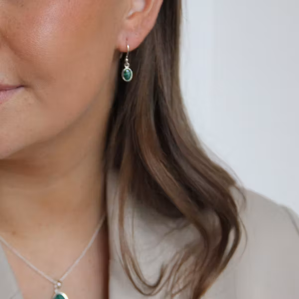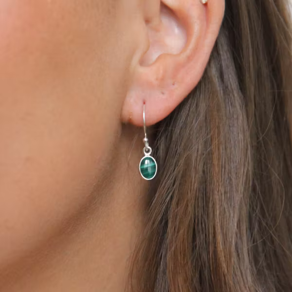 Vackert par örhänge med grön malakit i fin silverrams-infattning. Stenen är ca 18x6mm. Malakit har ansetts vara en kraftfull skyddsten för att avvärja ondska och negativa influenser och hjälpa till med att fatta kloka beslut. Malakit har traditionellt använts i ritualer för att fördjupa andlig insikt och öka medvetenheten om ens inre känslor. Dess förmåga att främja balans och harmoni har också bidragit till dess popularitet inom healing och alternativ terapi.
