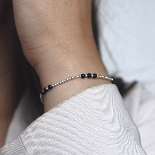 Ett vackert och enkelt armband med små silverkulor och 18 små stenar i form av äkta svart onyx. Armbandet är elastiskt och kulorna sitter på ett silikonba