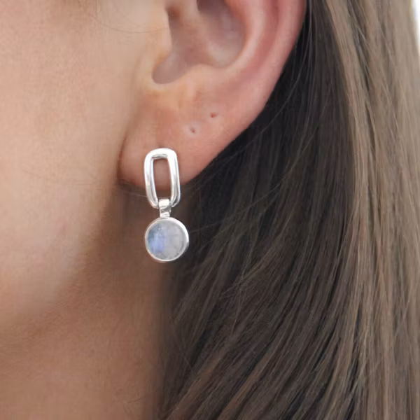 Ett par magiska silverörhängen med äkta månsten. Klassisk och tidlös design. Fantastiskt vackra! Örhängena mäter 9x22mm. Stenen mäter 9mm i diameter.