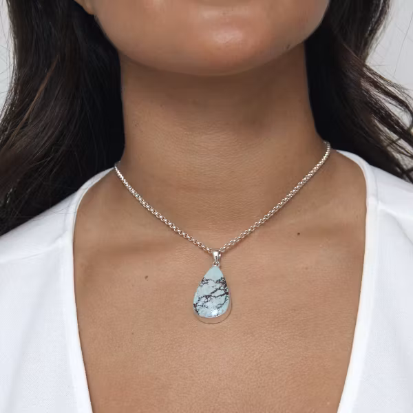 Ett fantastiskt vackert halssmycke i silver med äkta turkos. Detta halssmycke mäter 45x20mm inklusive hänget. TURKOS: Turkos sägs vara visdomens sten och d