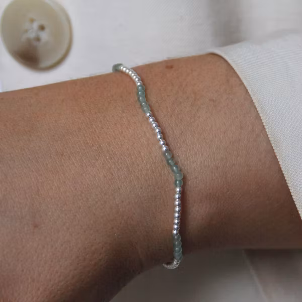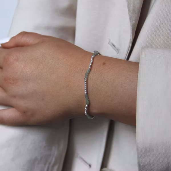 Ett charmfullt armband med små silverkulor och skimrande stenar av äkta grön jade. Det elastiska armbandet är trätt på en mjuk silikontråd som gör det bekvämt a