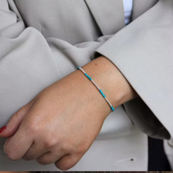 Ett charmfullt armband med små silverkulor och skimrande stenar av äkta turkos. Det elastiska armbandet är trätt på en mjuk silikontråd som gör det bekvämt att