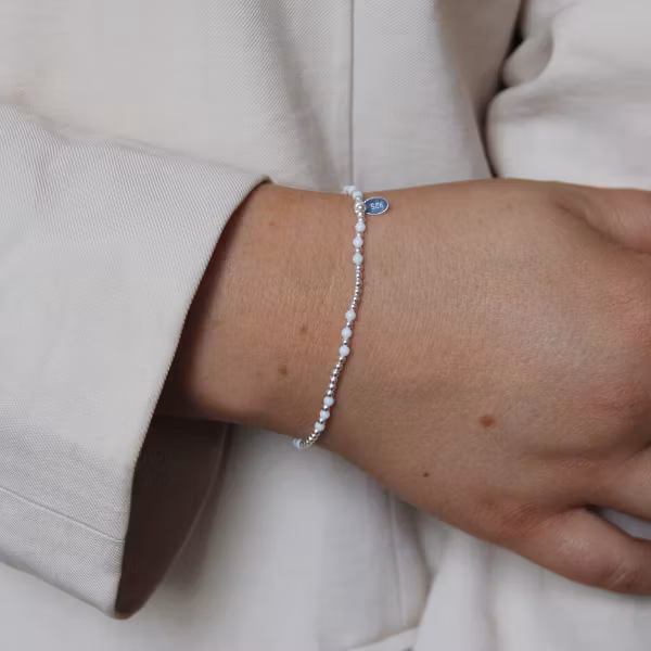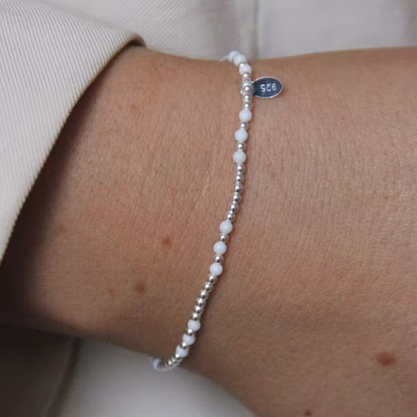 Ett charmfullt armband med små silverkulor och skimrande stenar av äkta vit onyx. Det elastiska armbandet är trätt på en mjuk silikontråd som gör det bekvämt at