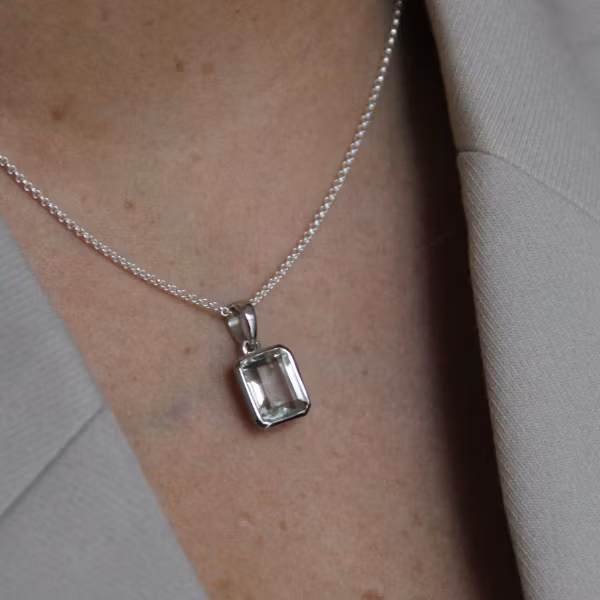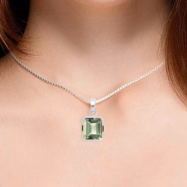 En otroligt vackert halsband med silverinfattad grön ametist. Stenens storlek är ca 12x9mm. GRÖN AMETIST: Gröna ametisten sägs främja intuition, kreativite