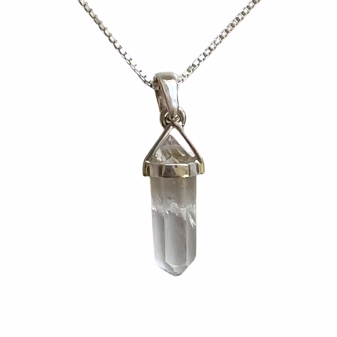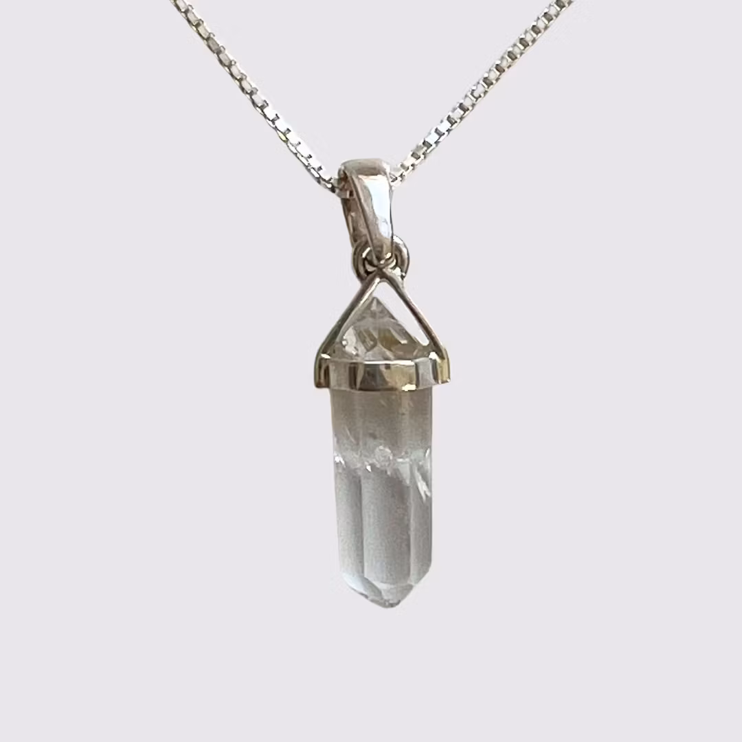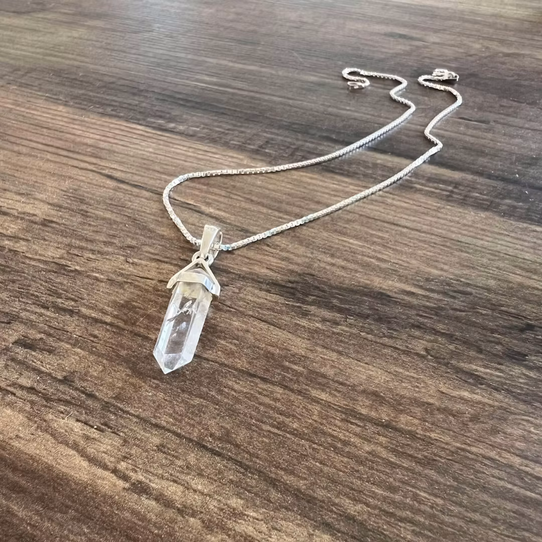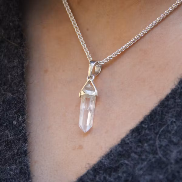 Detta är ett vackert handgjort halsband med silver och en sten av bergskristall. Silvret har omsorgsfullt formats runt stenen för att inte behöva manipulera stenens form.