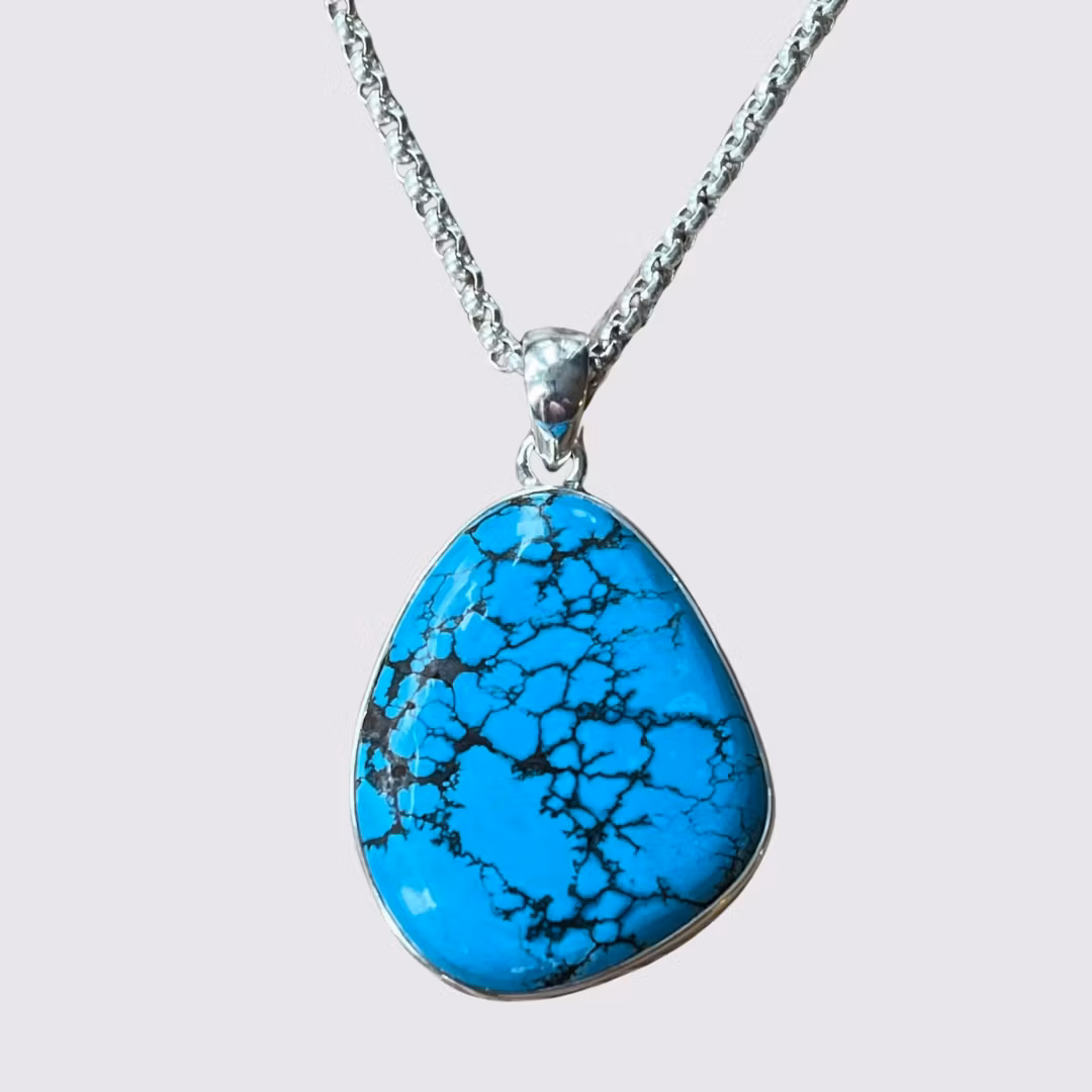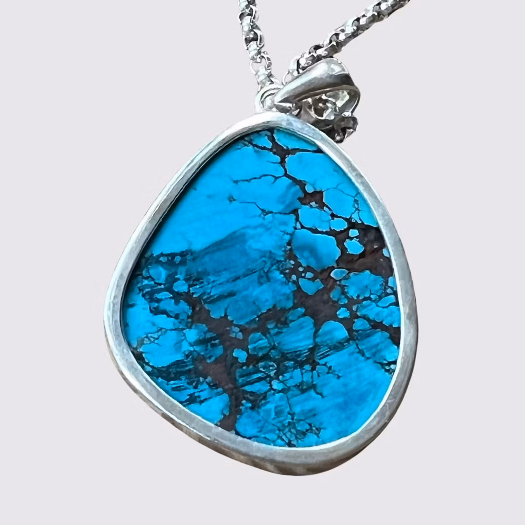Halsband med en stor vacker turkos där silverinfattningen formats efter själva stenen. Baksidan är rå, alltså ingen silverbaksida utan man ser stenen rakt igeno