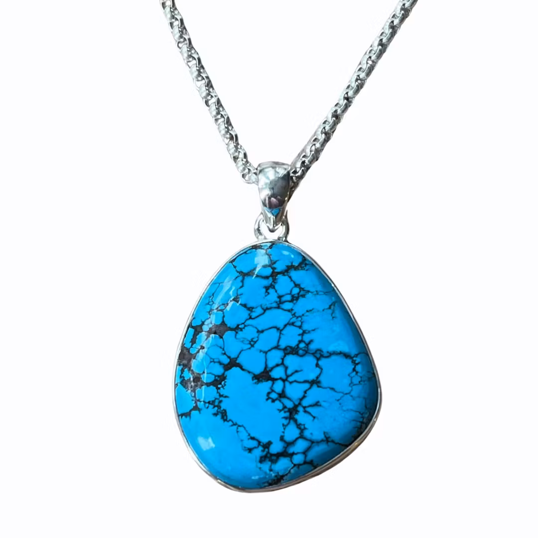 Halsband med en stor vacker turkos där silverinfattningen formats efter själva stenen. Baksidan är rå, alltså ingen silverbaksida utan man ser stenen rakt igenom.