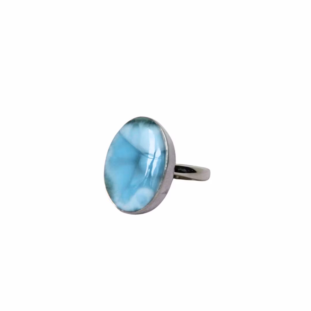 En vacker ring med stor larimarsten. Finns endast i ett enda exemplar. Storlek: LARIMAR: Larimar ger oss både frihet och gemenskap i relationer. Den stöder