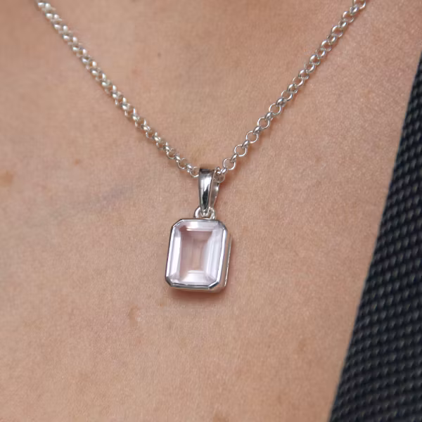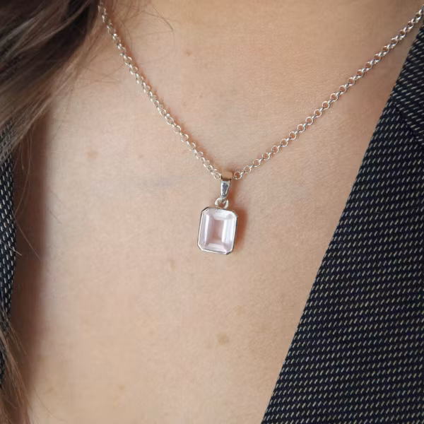 Ett fantastiskt fint halssmycke i silver med äkta rosenqvarts. Fyrkantig form. Stenen med infattning mäter 11x9mm. Kedja ingår ej, det väljer du själv till i menyn för kedjor om du önskar. ROSENQVARTS: Rosenqvarts sägs vara en moderlig och kärleksfull kristall som lär öppna upp för sann och äkta kärlek. De sägs lugna stress och lindra vid sorg, där de även lär sprida en kärleksfull vibration. Det sägs att denna otroligt kärleksfulla och fina kristall kan användas av barn och unga som känner sig ensamma och oroliga, där kristallens fina energier lär lugna dessa känslor.